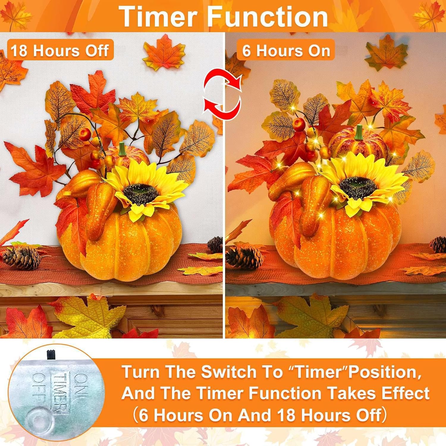 [Timer & Prelit] Thanksgiving Decorations Fall Decorations for Home, Artificial Fake Pumpkin with Maples Leaves Sunflower Berried 20 LED Lights Halloween Fall Centerpieces for Tables Home Porch Indoor