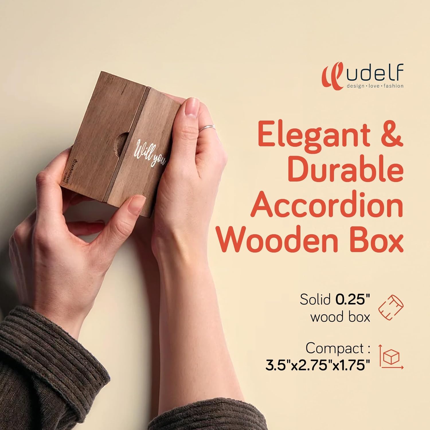 🌲 Rustic Charm Meets Thoughtful Design 🌲 Crafted from solid 0.25" wood, this accordion-style box blends rustic elegance with lasting durability. Its natural finish and engraved “Will You” lid add a warm, handcrafted touch to your special moment.