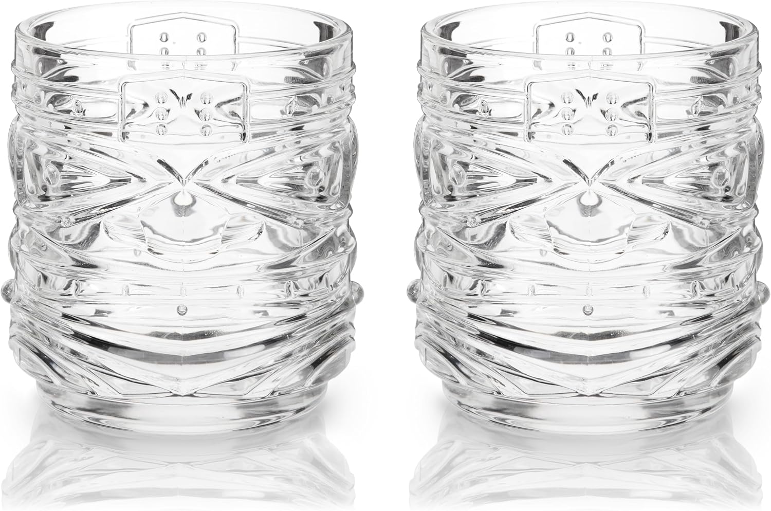 BOLD TIKI FACE DESIGN – Strong lines with deep angles in these cocktail glasses create an eye-catching tiki face. Every drink you make will look stunning thanks to the clarity of these lowball cocktail tumblers. Stand out from kitschy tiki mugs.