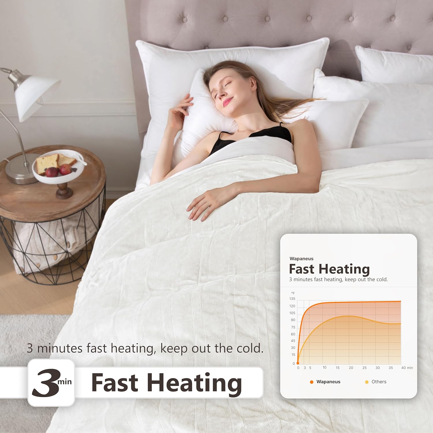 【Fast Heating & Luxuriously Soft】 The WAPANEUS superior heated blanket adopts a double-sided design with both sides made of 220GSM skin-friendly and high-quality flannel, providing a warm and comfortable experience. The blanket is equipped with 10 heat settings (95℉- 113℉) and 12 hours timer settings. The fast heating function helps you stay cozy and combat cold weather in a very short time.