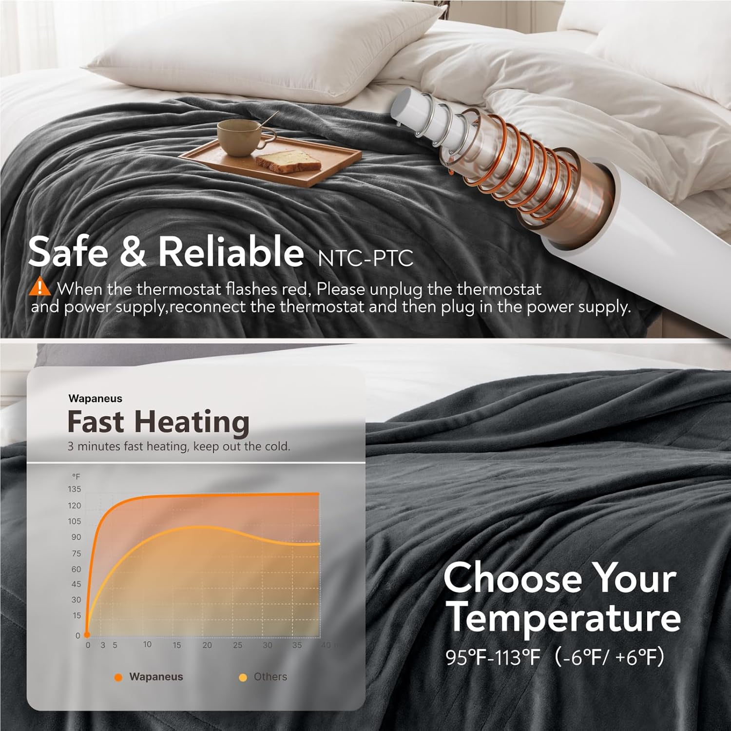 【Safety First & Quality Assurance】 The quality and safety of the heating blanket are ETL certified, ensuring high standards of performance and safety. The throw features overheat protection and short-circuit protection design, providing you with peace of mind while using the product. To maintain safety, do not stack electric throws, and always remember to turn off the power when leaving the room. Additionally, avoid covering the thermostat with electric blankets when in use.