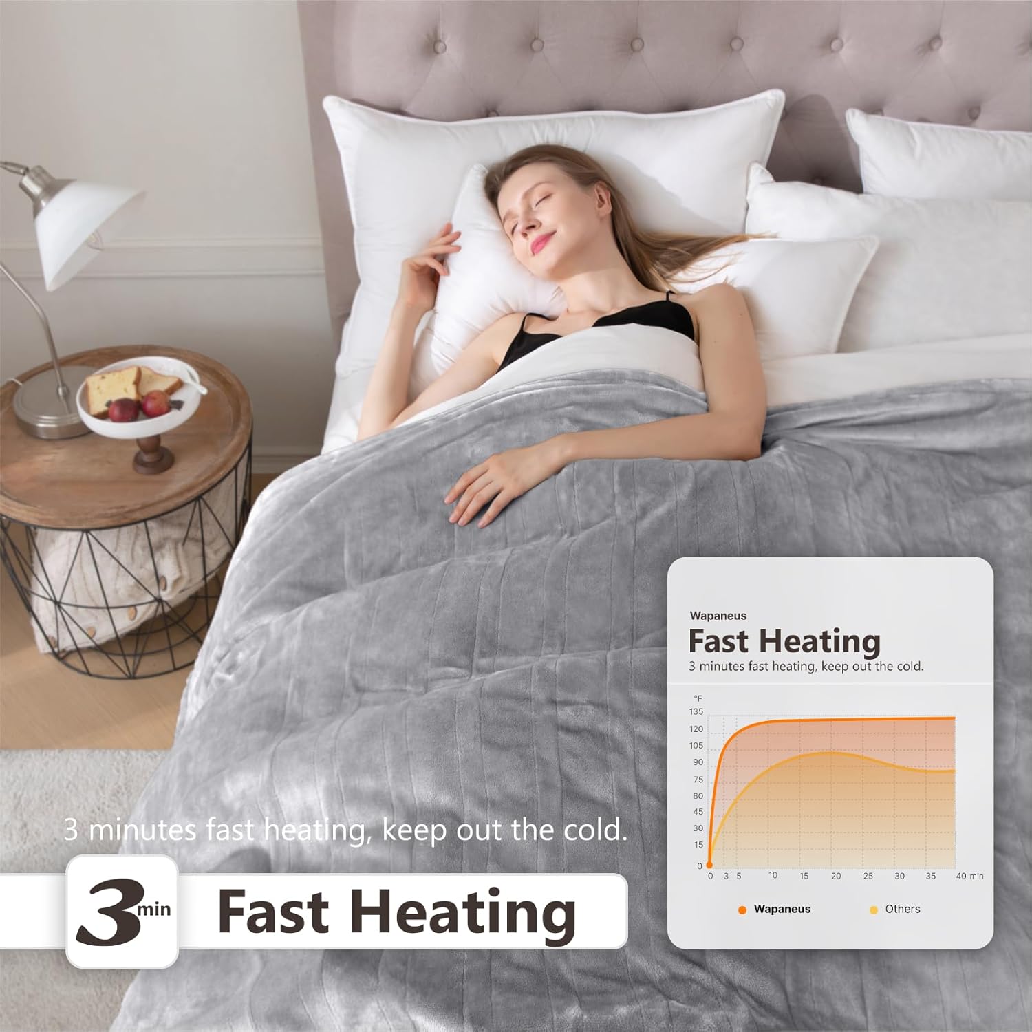 Wapaneus Heated Blanket Electric Throw 62" x 84" Twin Size with 10 Heat Levels and 12 Hours time Settings, Flannel Fast-Heating, ETL Listed, Machine Washable,Light Grey