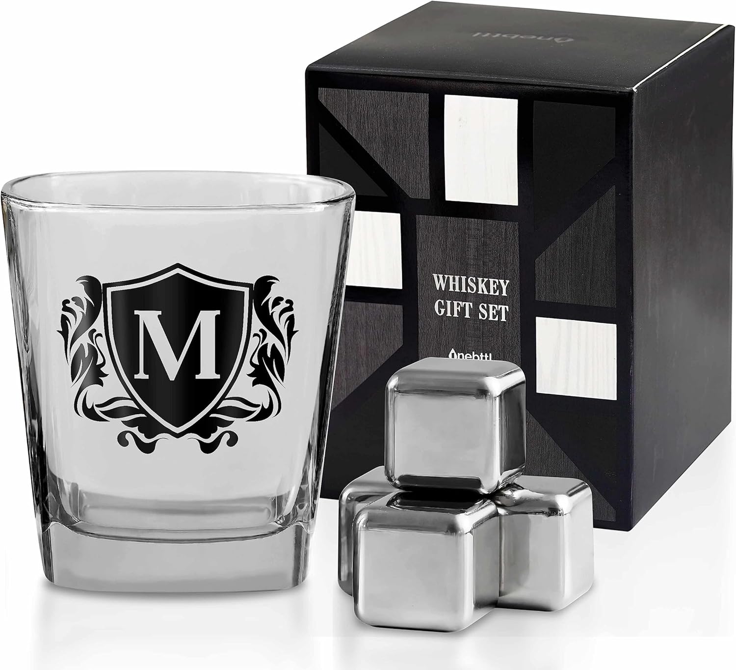 Whisky Gifts for Men, Personalized Initial Whiskey Glass with Whiskey Stones for Dad, Boyfriend, Best Friends, Coworkers, Husband, Brother, Uncle and Boss on Father's Day, Boss Day and Birthday - M