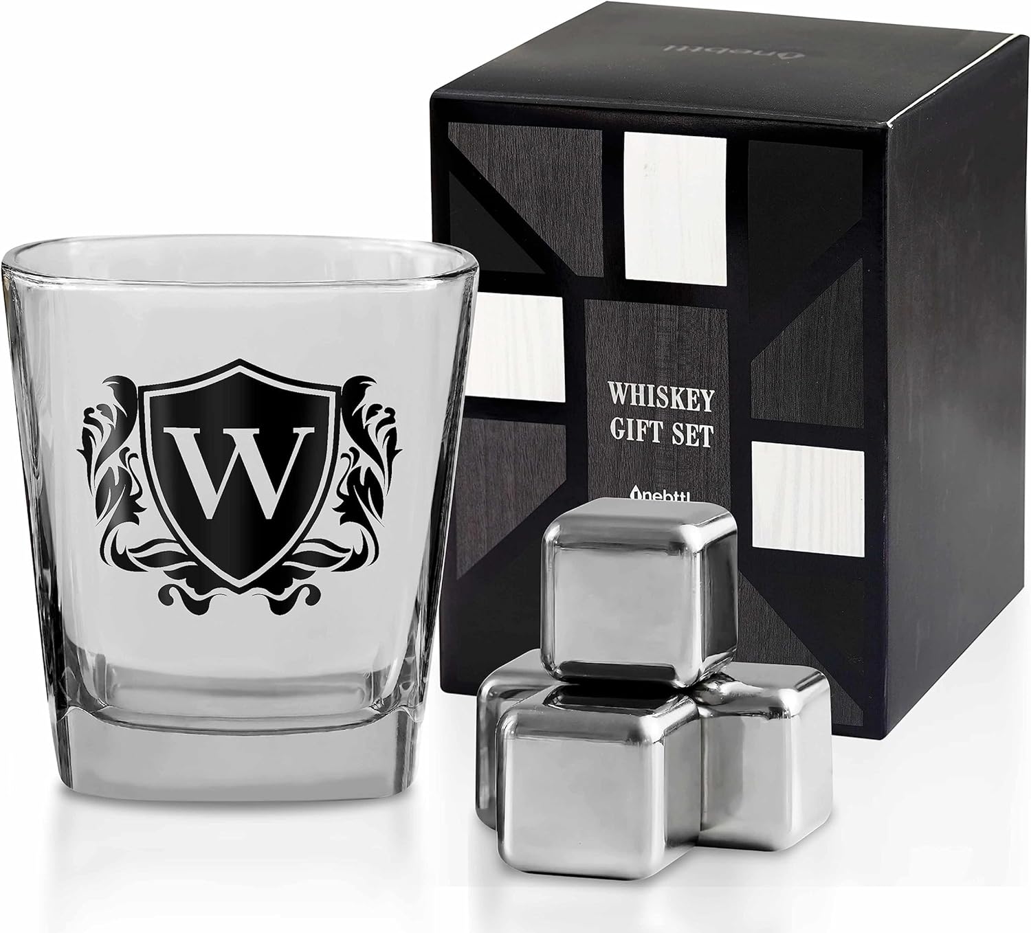 Whisky Gifts for Men, Personalized Initial Whiskey Glass with Whiskey Stones for Dad, Boyfriend, Best Friends, Coworkers, Husband, Brother, Uncle and Boss on Father's Day, Boss Day and Birthday - W