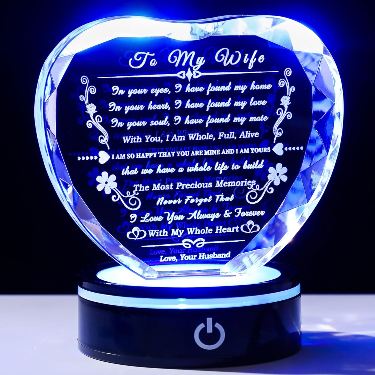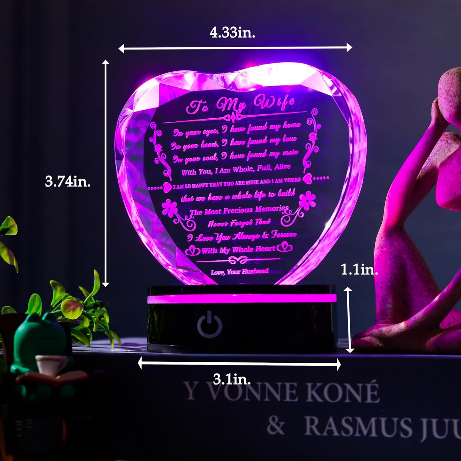 Wife Gifts with Colorful LED Base, Anniversary Birthday Gift Ideas for Wife, Romantic to My Wife Heart Crystal Gifts for Wife from Husband on Valentine's Day Christmas Mother's Day, Clear