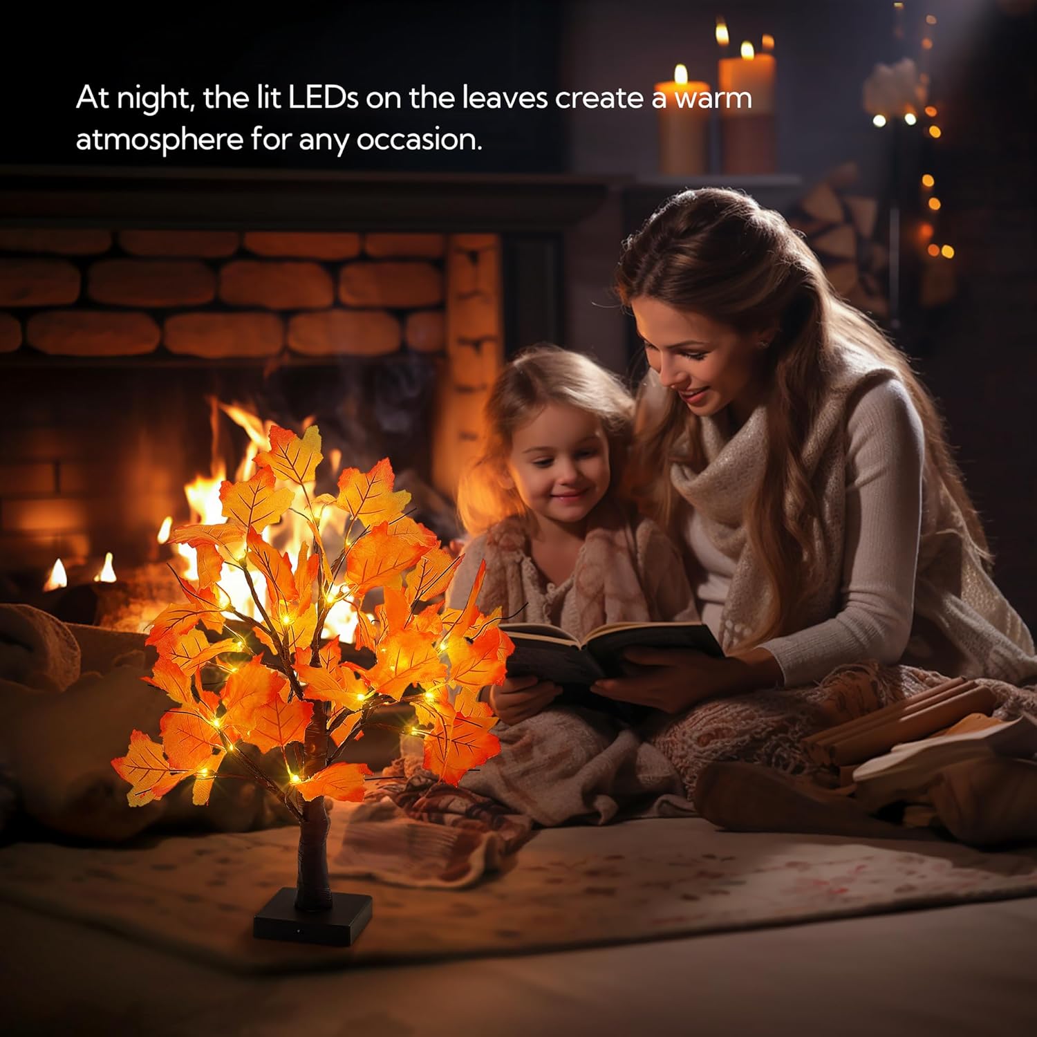 【Fall Decor Lighted Maple Tree】 An artificial pre-lit fall maple tree standing 20.5 inches tall, with a stable 3.94×3.94-inch square base. It features 24 warm white LED bulbs and 48 orange maple leaves (with eco-friendly brown tape), adding a cozy vibe to any space. Ideal for fall and Halloween.