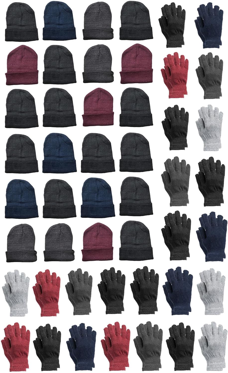 48 PAIRS OF ASSORTED COLORFUL WINTER GLOVES AND BEANIE HATS IN BULK: You will receive 24 colorful hats, 24 pairs of colorful gloves. This wholesale bulk pack is popular for homeless donations, charity events, as well as large events. Men winter accessories sets.