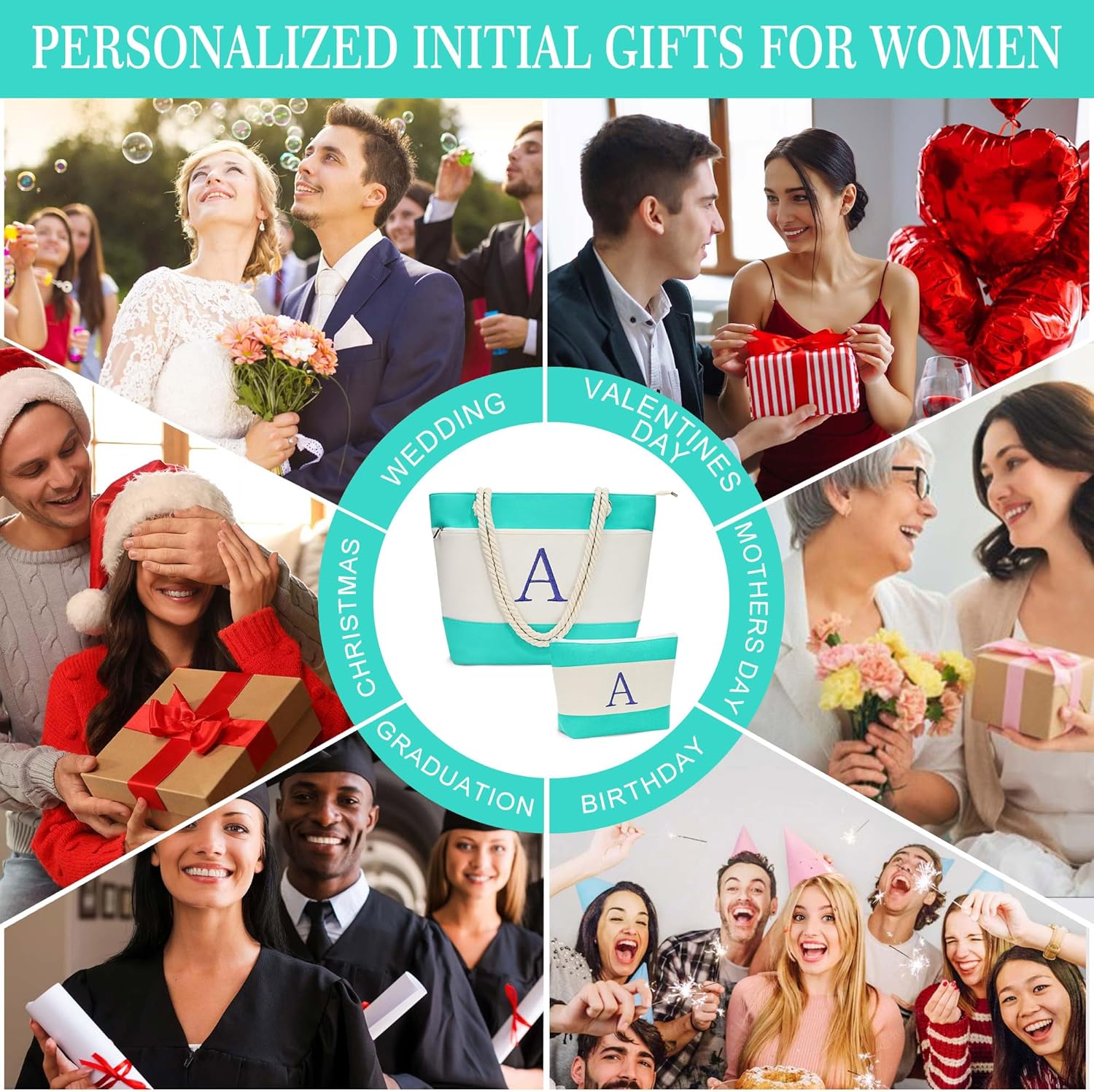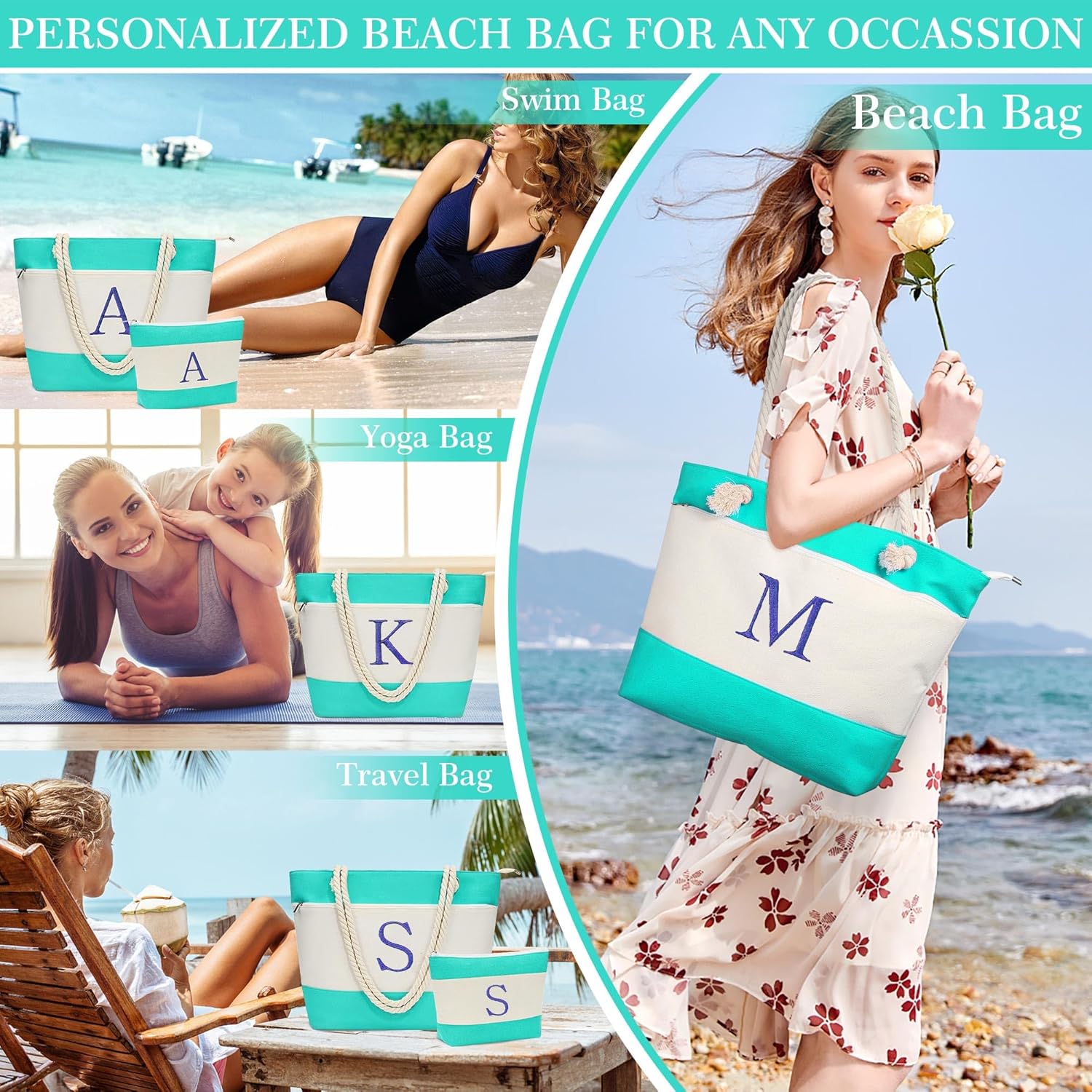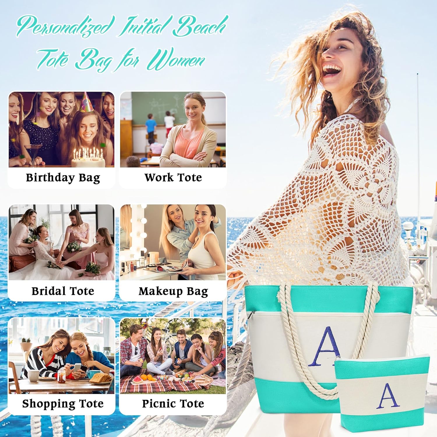 YOOLIFE Beach Bags for Women - Initial Canvas Tote Waterproof Bag with Makeup Bag Gifts for Women Mom Friend Birthday Her