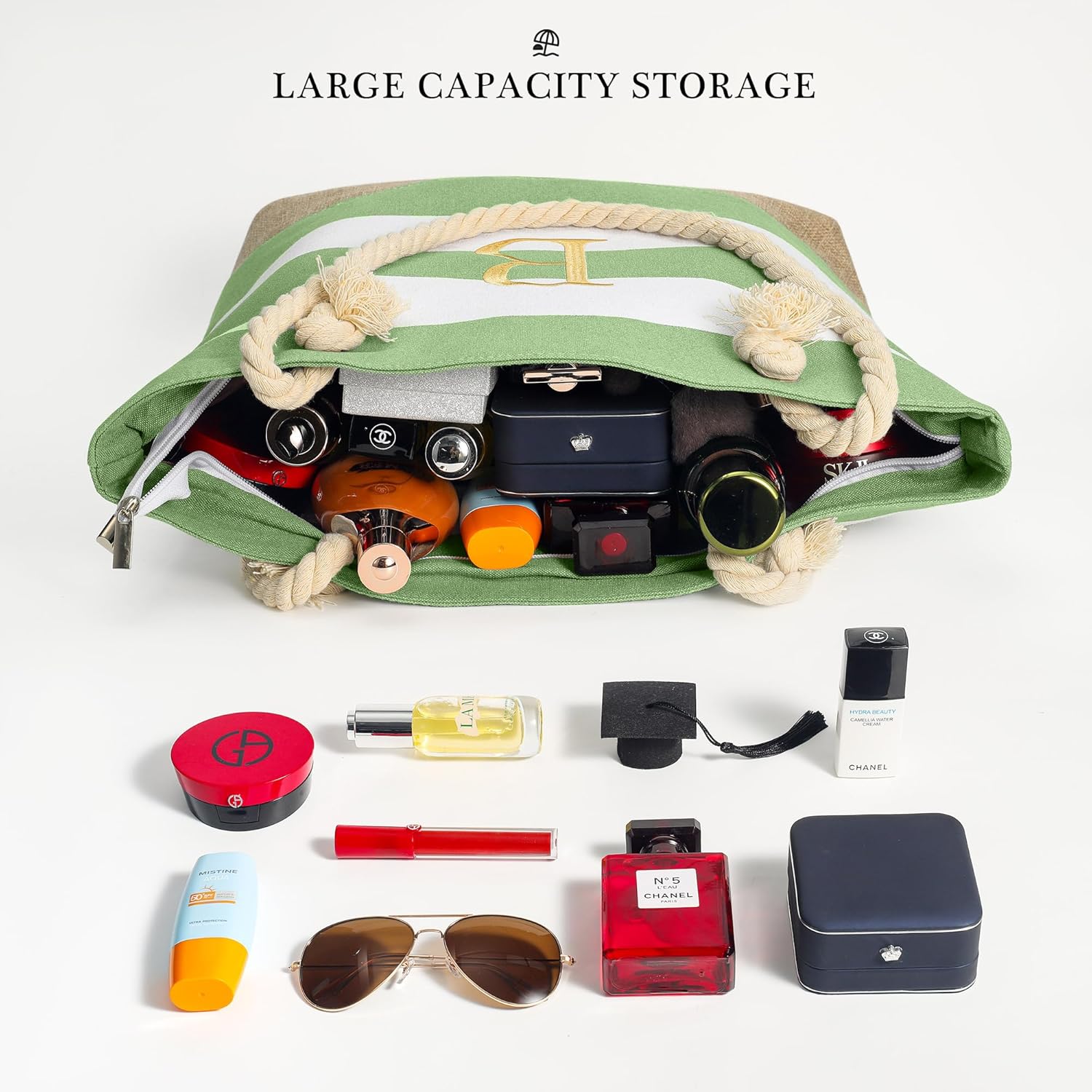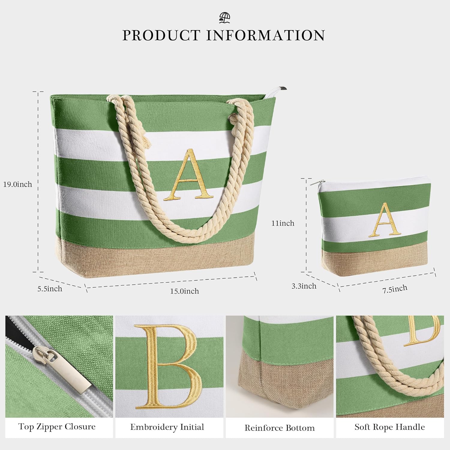 【Large Capacity】The beach bag has a large capacity, the size of the large beach bag is 18.9"* 5.5"* 14.9"inches, the size of the cosmetic bag is 11"* 7.5"* 3.3"inches. The main bag provides enough space to store extra clothes, shoes, food, water bottles and other beach items. The cosmetic bag is reasonably sized and designed to put down the cosmetics and personal care products you need
