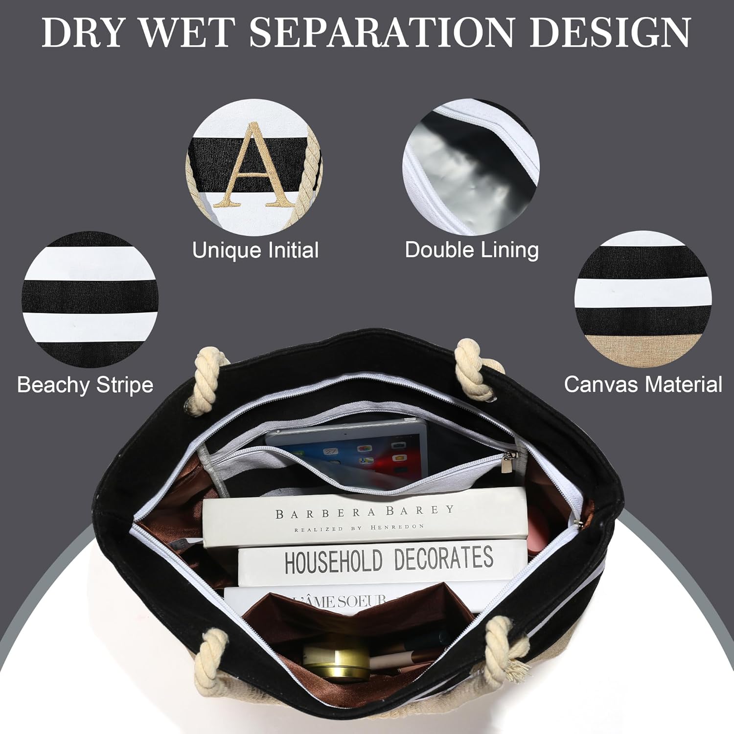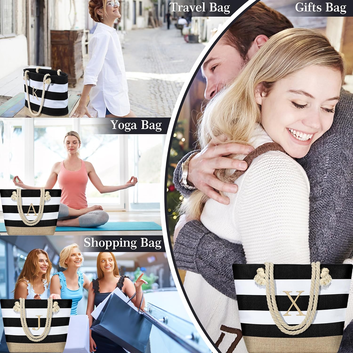 YOOLIFE Initial Canvas Waterproof Beach Tote Bag Zipper Personalized Gifts for Women Her Birthday Travel Beach Essential