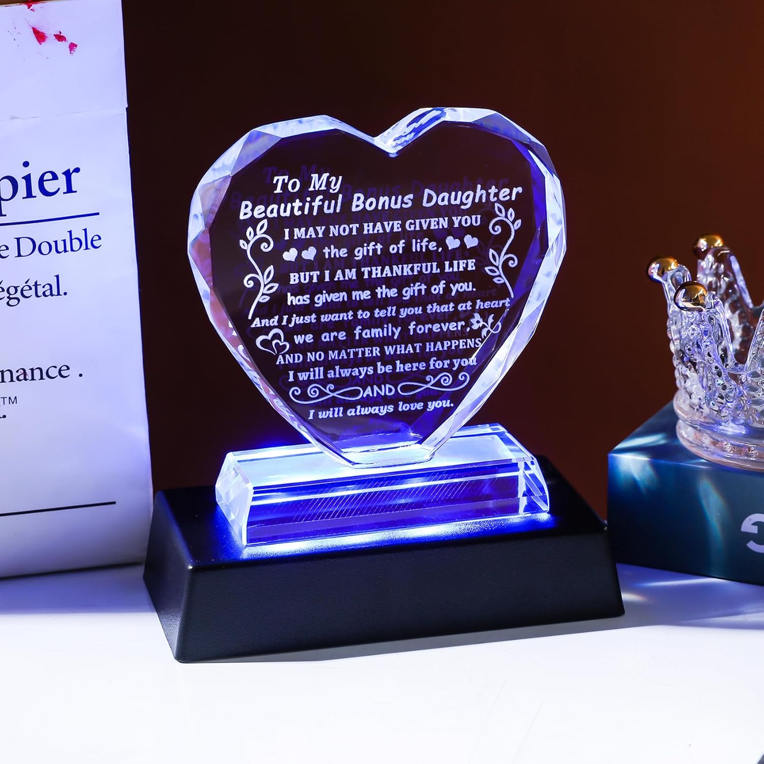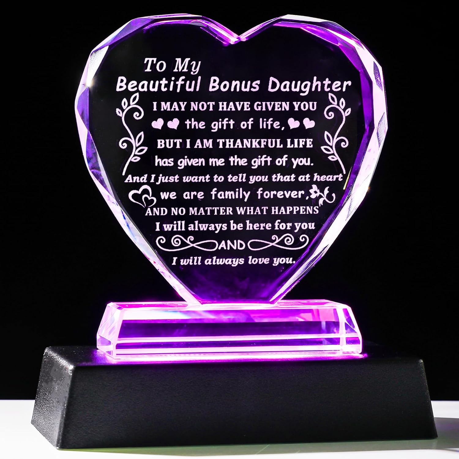 YWHL Bonus Daughter Gifts from Mom Dad, To My Bonus Daughter Gifts Heart Shaped Glass Keepsake with Colorful Light Base, Gift for Stepdaughter on Birthday Christmas Graduation