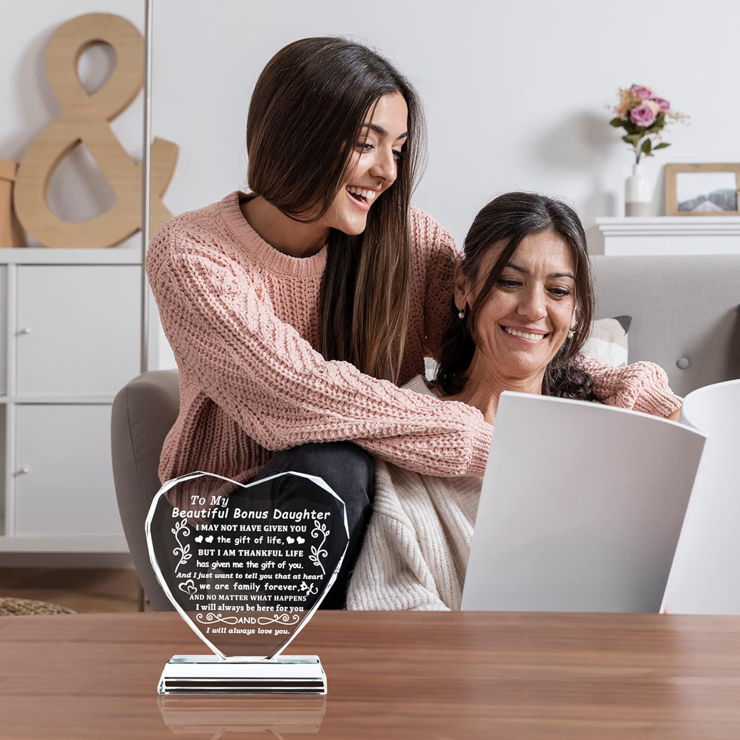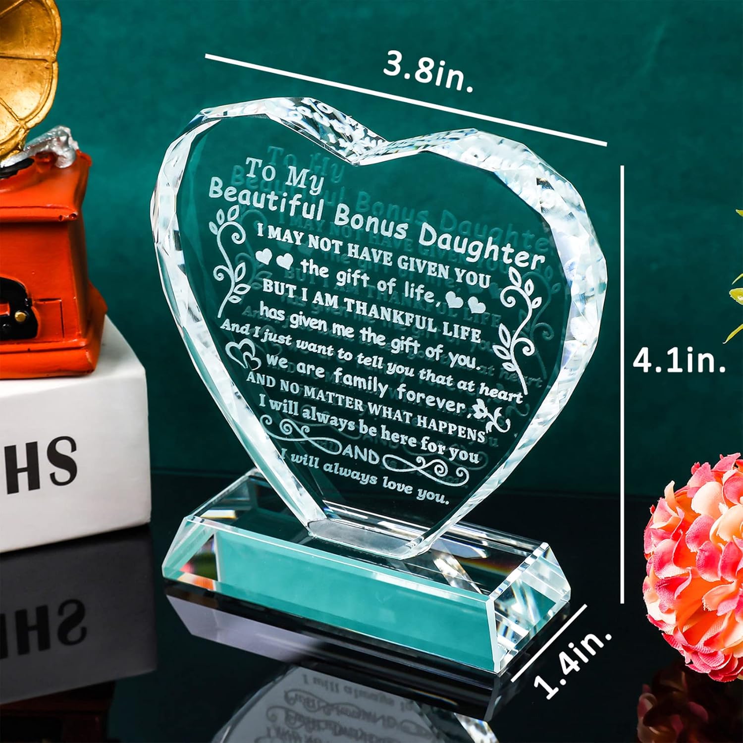 YWHL Bonus Daughter Gifts from Mom Dad, To My Bonus Daughter Heart Shaped Crystal Keepsake, Gifts for Stepdaughter from Stepmom Stepdad on Birthday Christmas Graduation