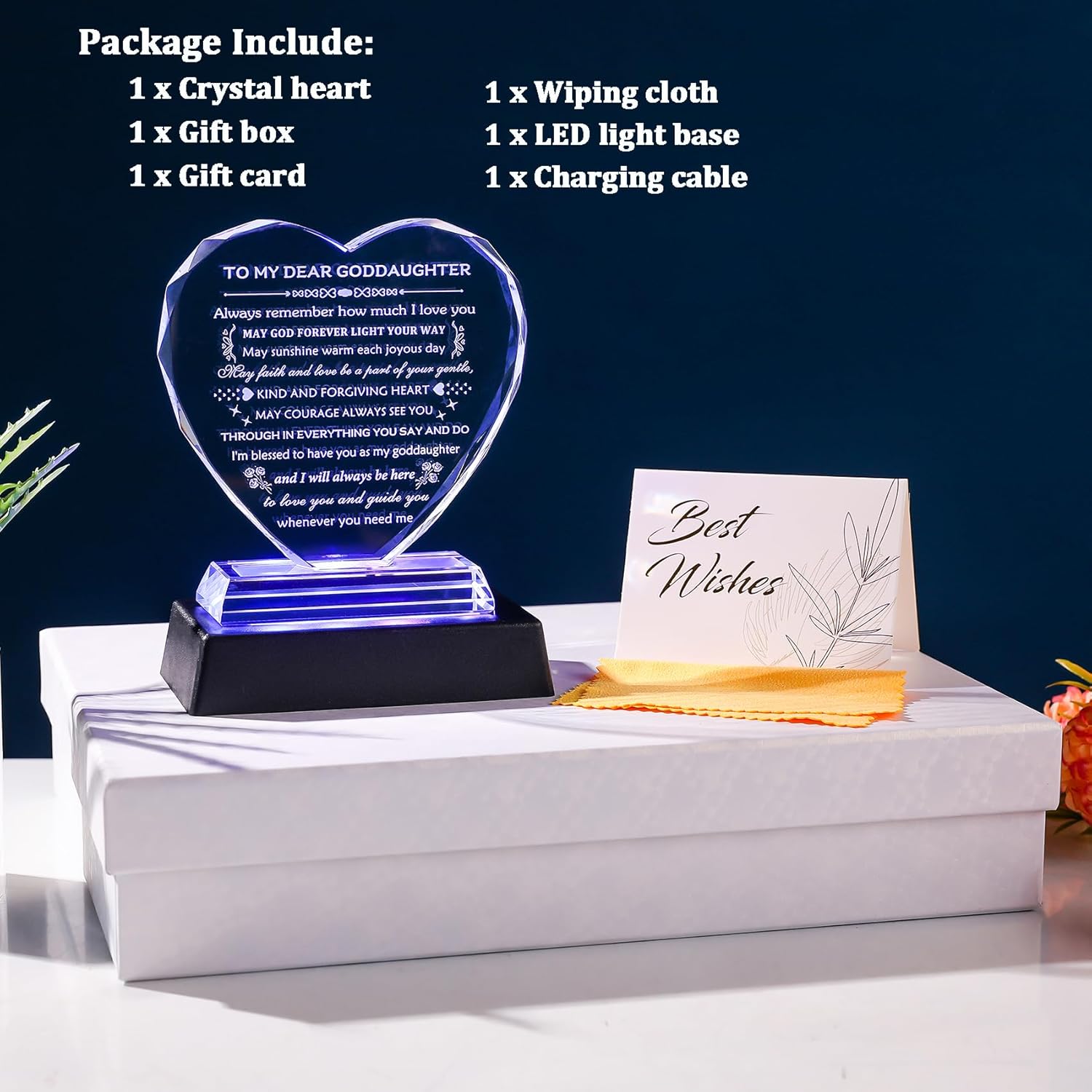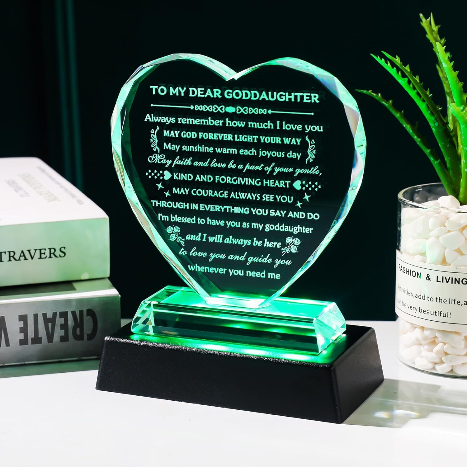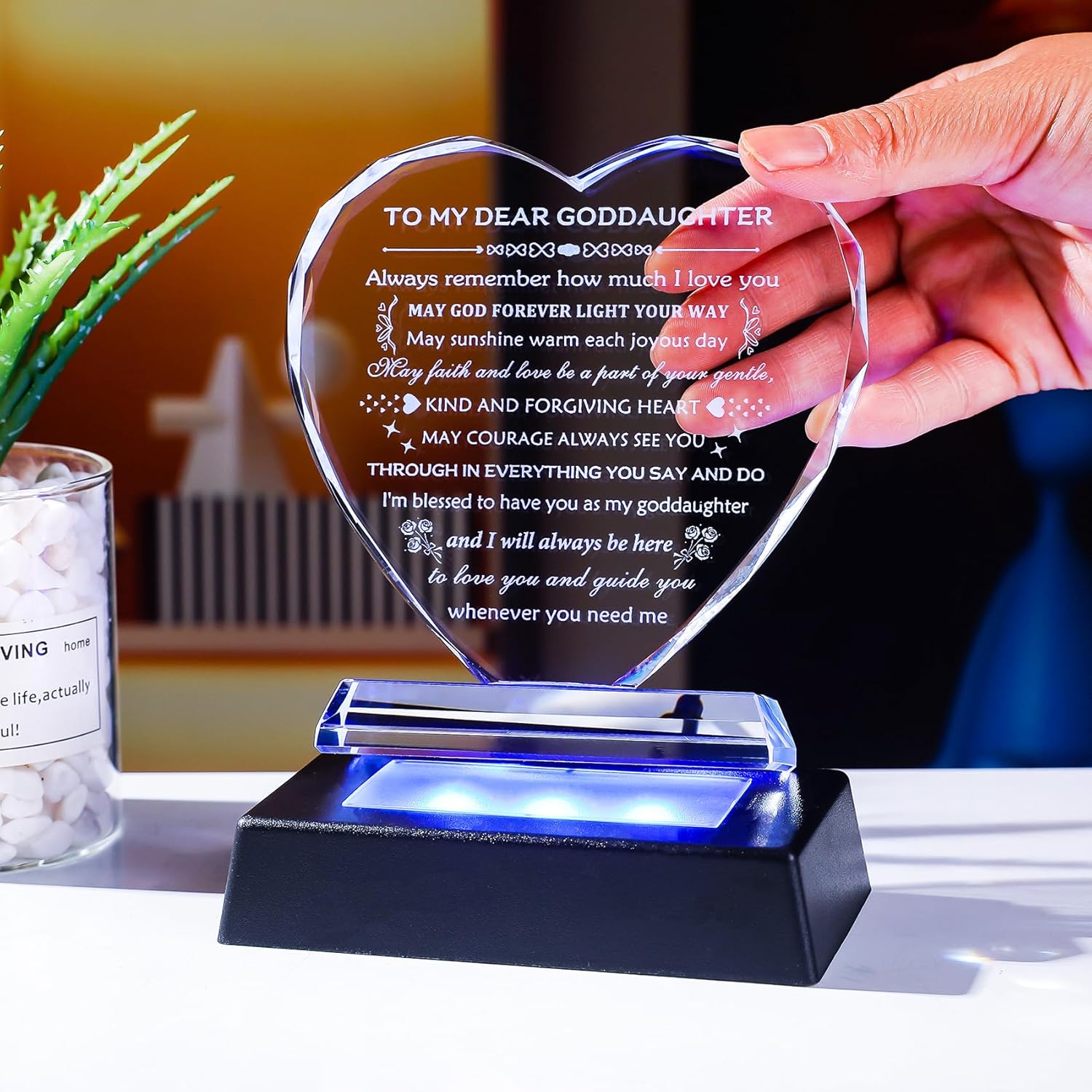 YWHL Goddaughter Gifts from Godmother Birthday Gifts for Goddaughter from Godparents with LED Base Heart Crystal Keepsake Unique Gift Idea for Goddaughter on Mother's Day Christmas