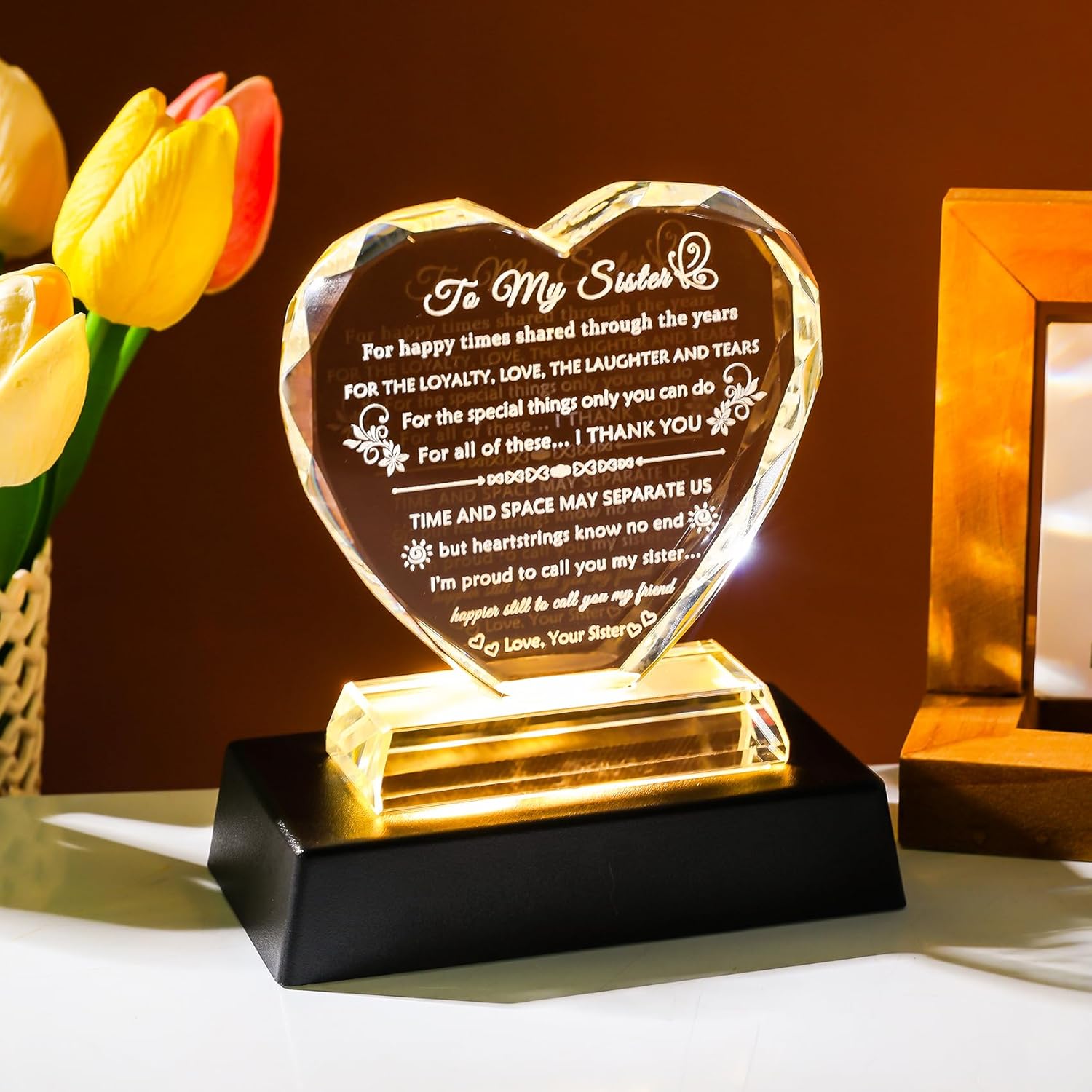 Meaningful Gifts for Sister: This heart-shaped crystal keepsake features a beautiful image and sentimental text - "For happy times shared through the years, for the loyalty, love, the laughter and tears... " The perfect gift from a sister or brother. This crystal heart is a meaningful souvenir and makes a great gift when you need a stronger expression of your love or encouragement for your sister
