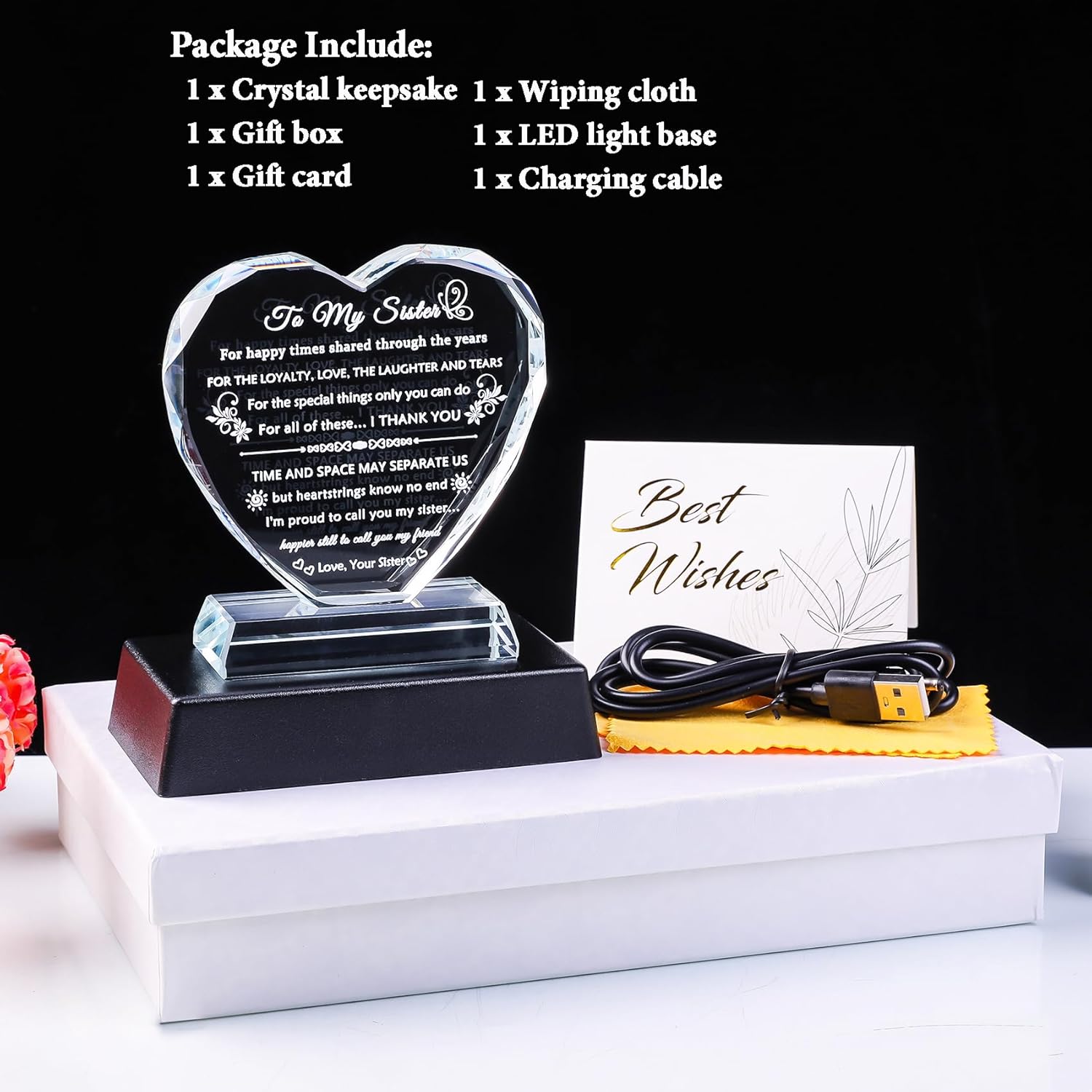 Great Home Decor: This crystal keepsake has a certain weight and can be placed on the table alone, with an LED light holder, The light base has two power sources, using a 3 AAA 1.5 V battery or use charging cable. It can be adjusted with 7 colors of light to create a warm atmosphere, as a small night light to accompany your sister. Can also be placed on a table, wall shelf, or bedroom table as a great home decoration