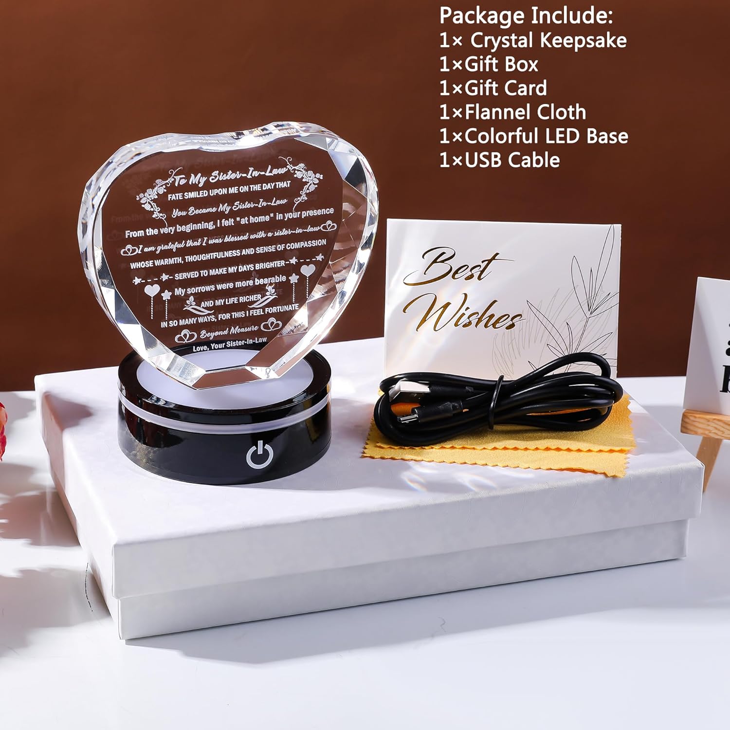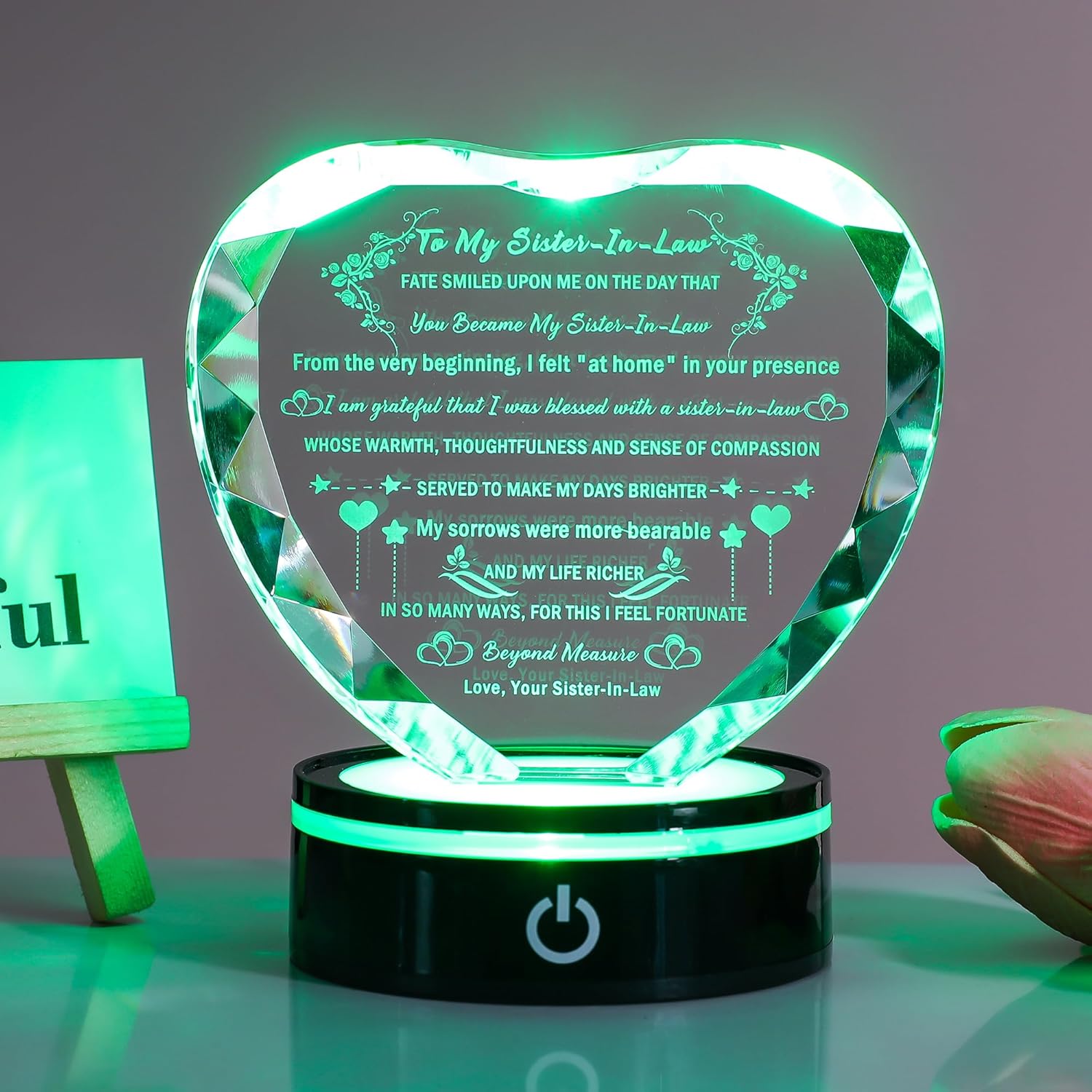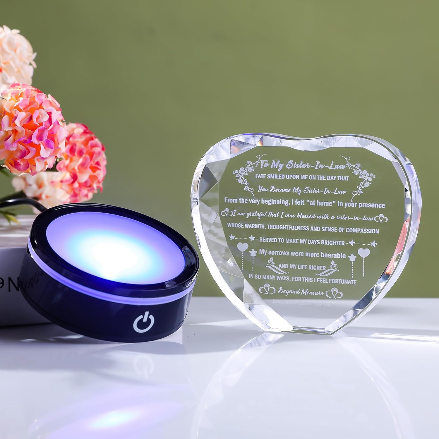 YWHL Sister in Law Birthday Gifts with Colorful LED Base Unique Heart Crystal Keepsake for Unbiological Bonus Sister Wedding Thanksgiving Gift Ideas