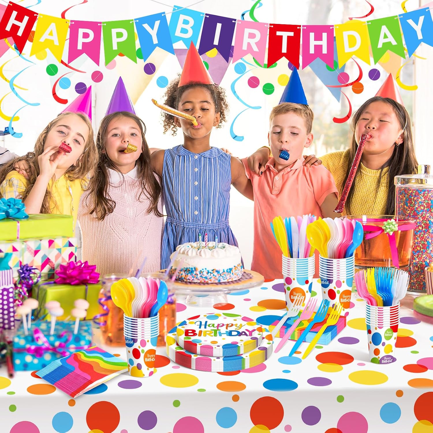 Zhehao Serves 129 Pcs Happy Birthday Party Supplies Set with Plates Napkins Cups Cutlery Rainbow Dot Birthday Decorations Kit Banner Tablecloth Hanging Honeycomb Balls Garland for Birthday Party